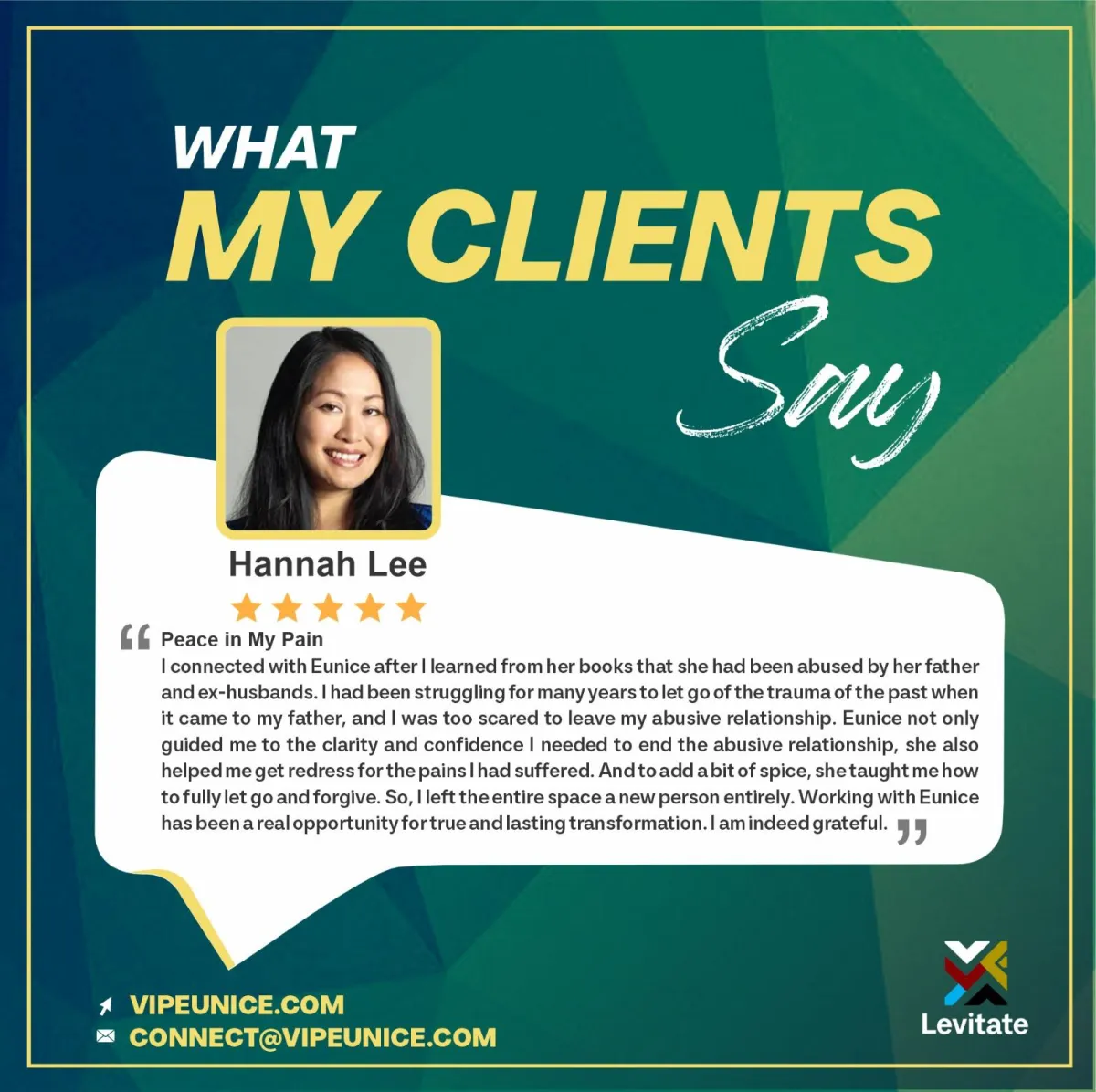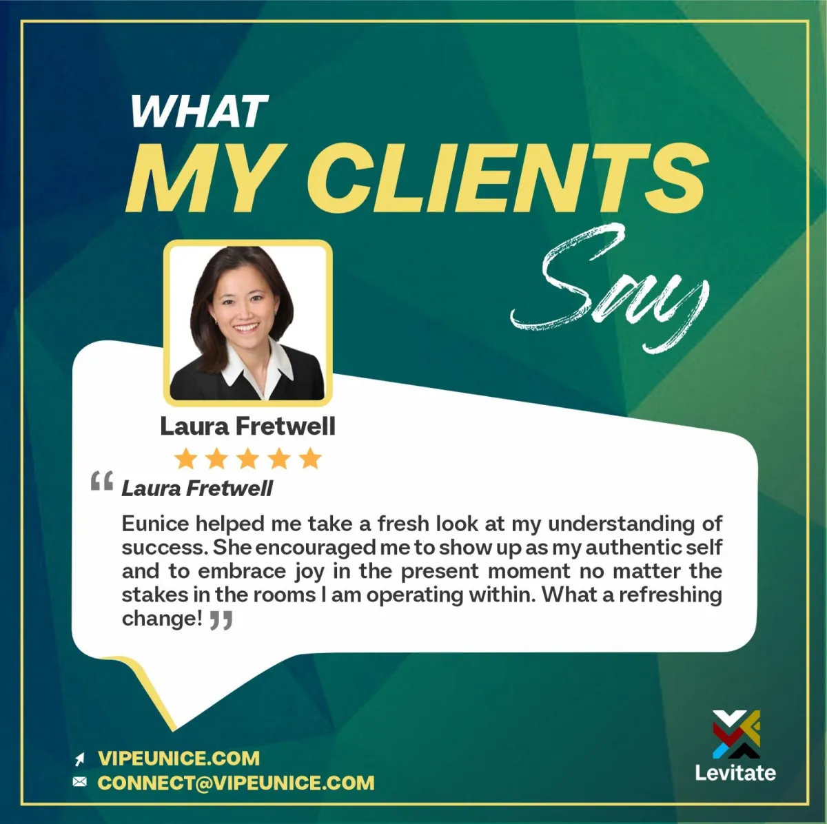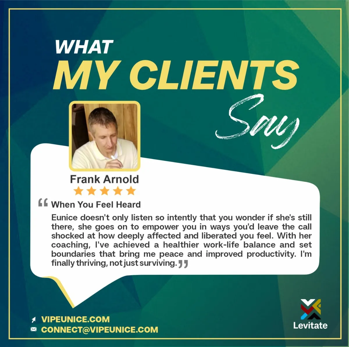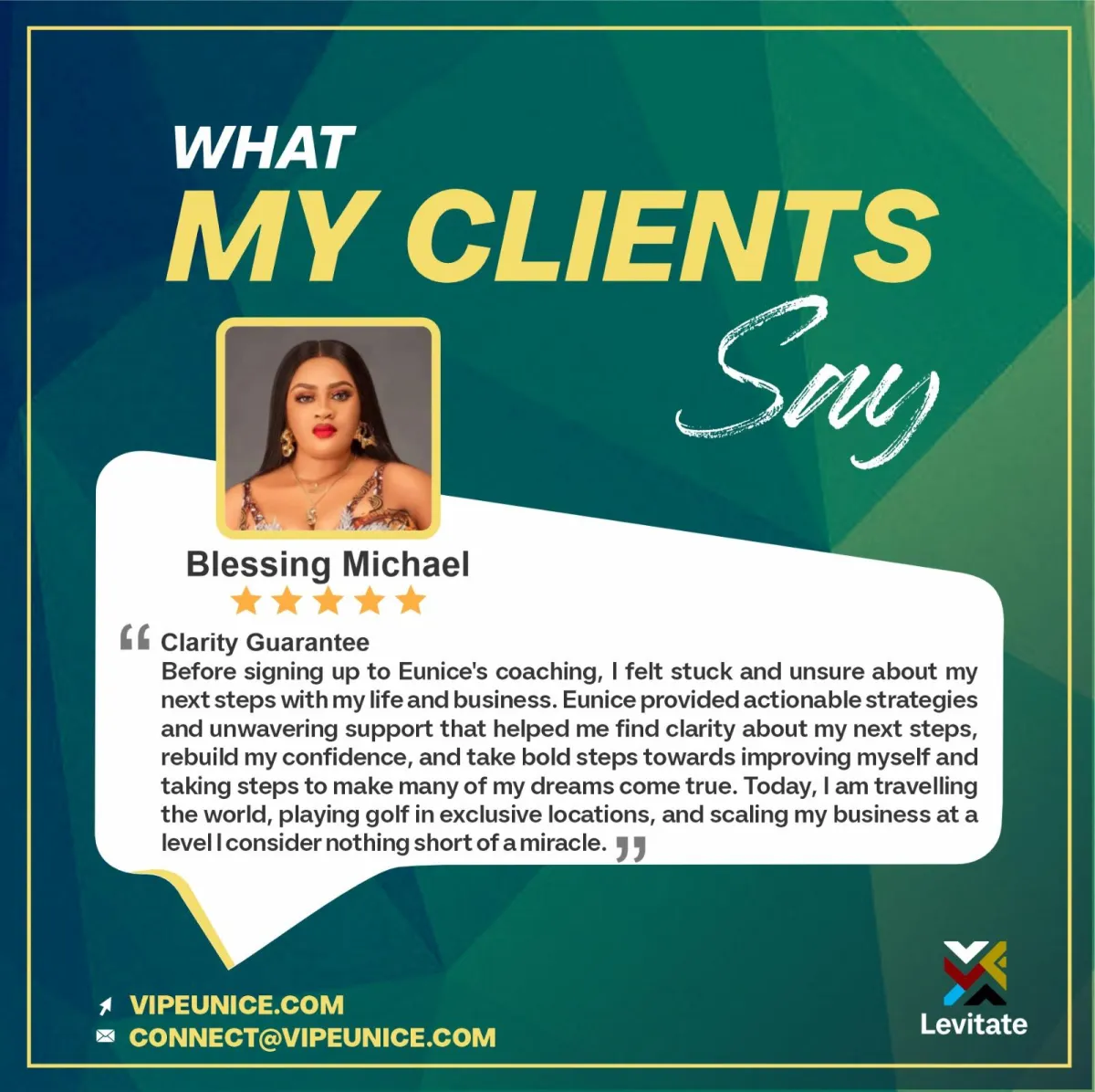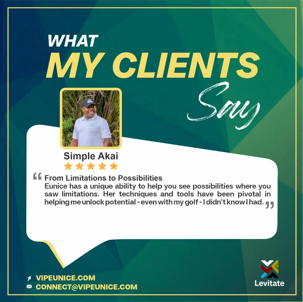 "Before signing up to Eunice's coaching, I felt stuck and unsure about my next steps with my life and business. Eunice provided actionable strategies and unwavering support that helped me find clarity about my next steps, rebuild my confidence, and take bold steps towards improving myself and taking steps to make many of my dreams come true. Today, I am travelling the world, playing golf in exclusive locations, and scaling my business at a level I consider nothing short of a miracle."